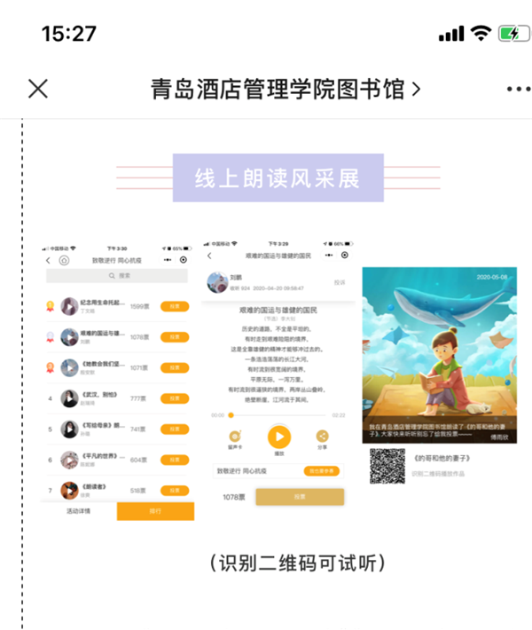 各總支、支部把讀書活動作為主題黨日活動的重要內容,創新思維,豐富形式,借助各種介質及新媒體平臺,通過線上線下相結合的方式,積極組織開展讀書沙龍、讀書分享會、領讀人等豐富多彩的系列活動,打造了“紅燭讀書會”“讀書片刻”等閱讀品牌,力求把讀書活動激發出來的學習熱情轉化為推動工作的干勁,實現學習成果的轉化。學院圖書館開展了“莫負春光好時節 閱讀學習正當時”為主題的讀書月系列活動,依托“21天閱讀打卡挑戰賽”“書香戰‘疫’,閱讀相伴”征文比賽、線上朗讀比賽等活動,充分發揮線上資源、平臺的優勢,通過開展各類閱讀推廣活動,提升師生的人文素養。