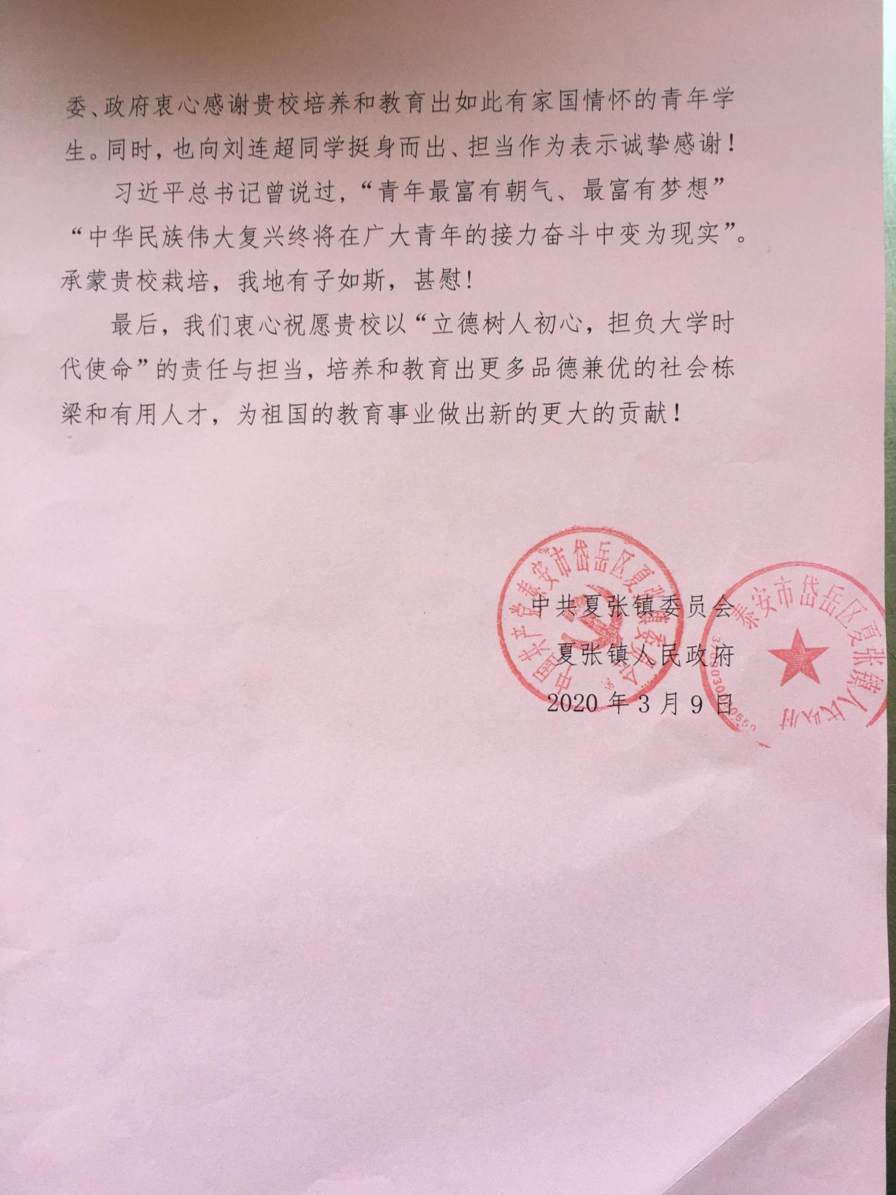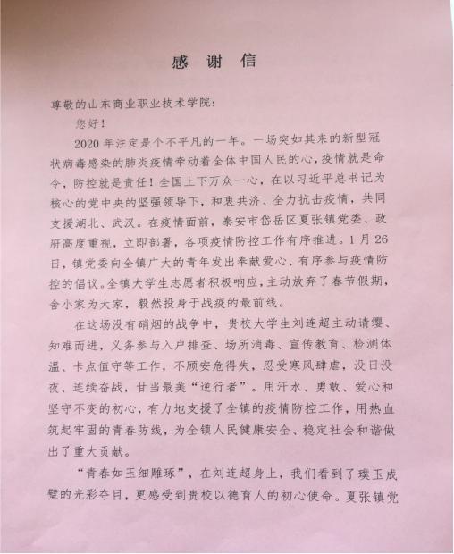 近日,山東商院收到了一封來自泰安市岱岳區(qū)夏張鎮(zhèn)的感謝信,信中對學院劉連超同學在當?shù)匾咔榉揽毓ぷ髦械母冻雠c貢獻表示感謝。