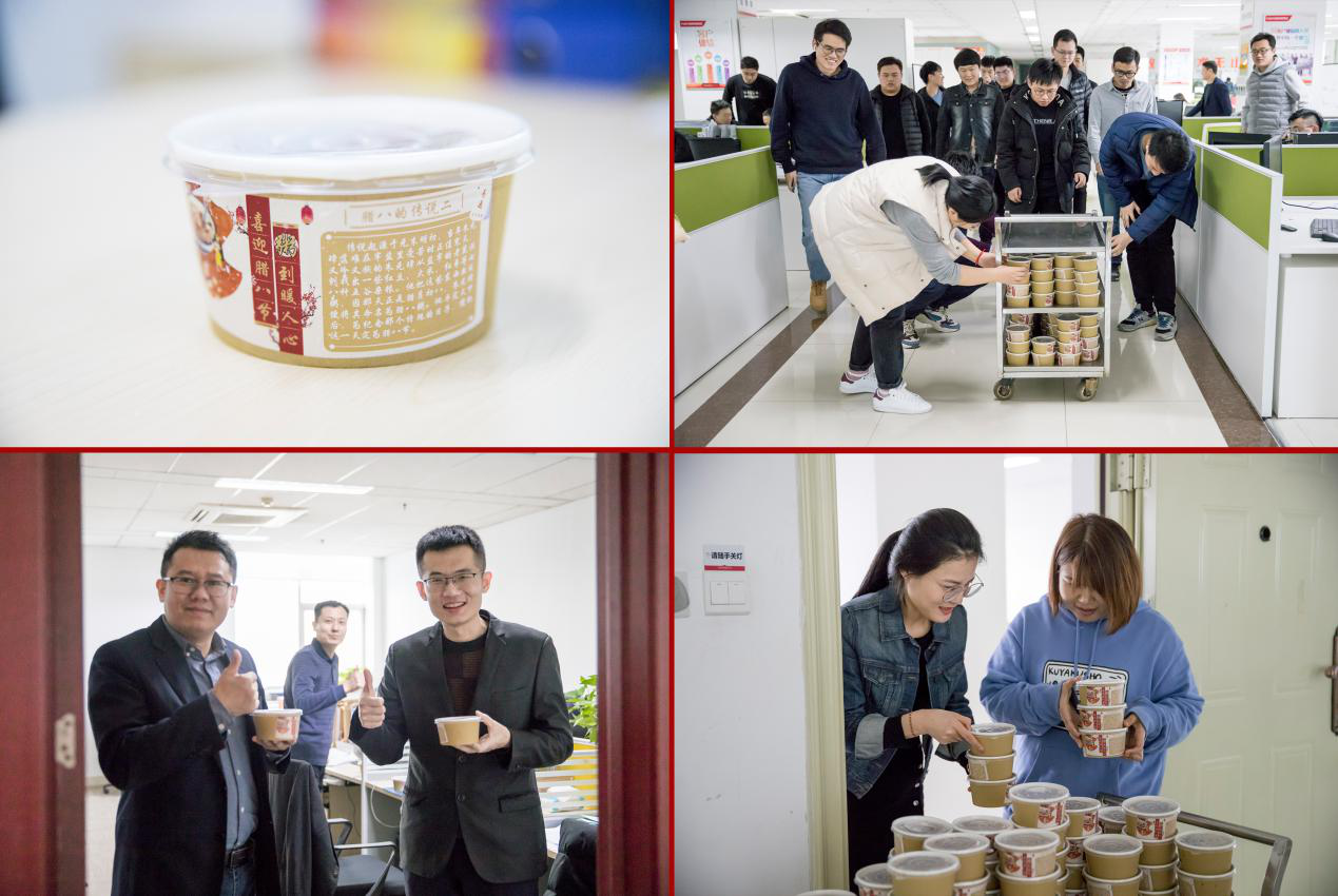 活動中,工作人員推著滿滿一車新鮮出爐、熱氣騰騰的臘八粥逐層為每一位員工送去節(jié)日祝福。一碗碗突然出現的臘八粥讓大家喜出望外,一份份貼心的祝福讓大家倍感溫暖。值得注意的是,此次臘八粥的包裝特別采用了可降解的紙質碗包裝,旨在透過寓意吉祥的臘八粥傳播環(huán)保理念,讓垃圾減量和綠色環(huán)保意識更加深入人心。此外,易通工會還在包裝盒的外側粘貼了印有“傳說小故事”的貼紙,讓大家了解臘八節(jié)的歷史淵源,在享受美食的同時收獲知識。