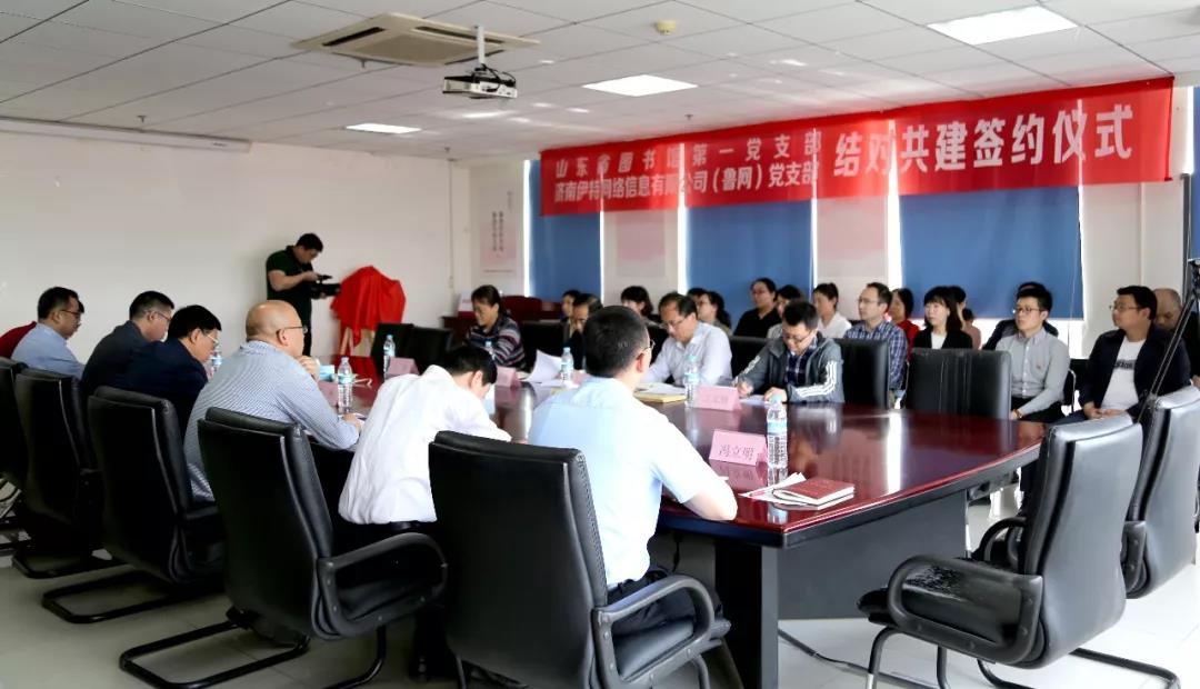 在魯網黨支部與省圖書館第一黨支部結對共建活動中,共建雙方就各自黨支部工作情況進行了介紹,并本著“學習交流、共同提高、雙向受益”的原則,由省圖書館第一黨支部書記吳金敦與魯網黨支部書記陶克簽訂結對共建協議。賈慶華、龐道鋒為共建雙方授牌。