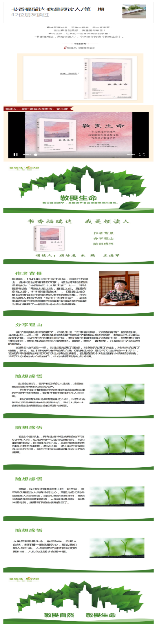 目前,“書香福瑞達,我是領讀人”第一期、第二期已經在福瑞達微信公眾號展出,隨后將以每周2-3期的速度陸續展出,引導大家持續閱讀。