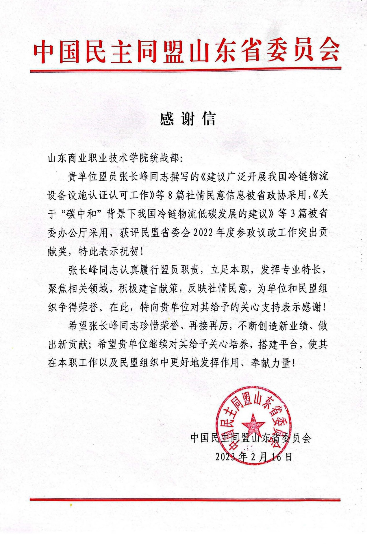 近日,民盟山東省委向山東商院發(fā)來(lái)感謝信,對(duì)學(xué)校給予民盟山東省委委員、民盟山東商院支部主委張長(zhǎng)峰的關(guān)心支持表示感謝,對(duì)張長(zhǎng)峰獲評(píng)“民盟省委會(huì)2022年度參政議政工作突出貢獻(xiàn)獎(jiǎng)”表示祝賀。