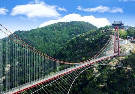 據(jù)了解,目前世界上較長(zhǎng)的懸索橋有瑞士的歐洲之橋(494米)、德國(guó)的“泰坦-RT”步行懸索橋(458米)、俄羅斯的索契天空公園橋(439米)、中國(guó)湖南張家界玻璃橋(430米)。而銀座天蒙景區(qū)的人行懸索橋全長(zhǎng)505.5米,在被群山環(huán)繞的天蒙景區(qū)里,它橫跨兩座山峰,凌空而起,是連接玉皇宮和望海樓兩個(gè)重要景點(diǎn)的交通要道。該人行索橋的建成避免了游客穿過深達(dá)143米的婁子溝,節(jié)約40分鐘的行程。