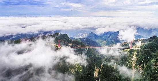 天蒙山人行索橋于2017年5月更換玻璃橋面,華麗變身為世界第一人行玻璃懸索橋。變身后的世界第一人行懸索橋愈加震撼,驚險(xiǎn)體驗(yàn)再次升級(jí),橫跨于兩座山峰之間,腳上腳下都是風(fēng)景,可360度無死角將高山、叢林之美盡收眼底。在郁郁蔥蔥的山川中,紅色的世界第一人行懸索橋更加醒目、壯觀,如遇云霧天氣,仙霧繚繞,更似人間仙境。