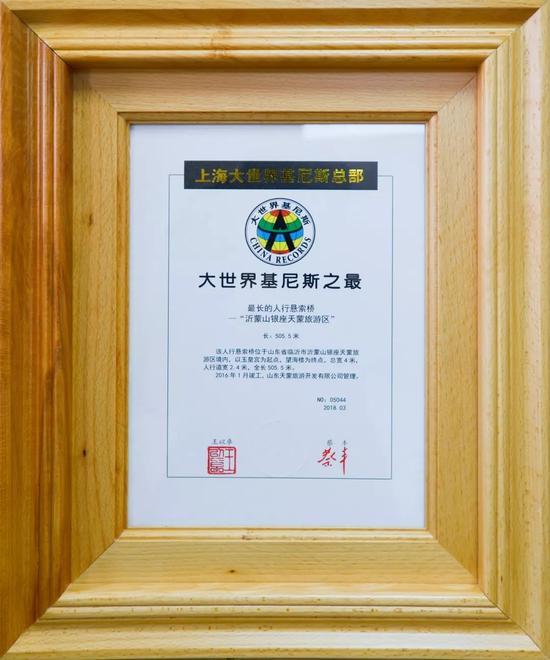日前,沂蒙山銀座天蒙旅游區(qū)的“網(wǎng)紅景點(diǎn)”——人行懸索橋通過大世界基尼斯總部權(quán)威認(rèn)證,獲得“大世界基尼斯之最”證書。這標(biāo)志著天蒙山全長(zhǎng)505.5米的人行懸索橋成功入選大世界基尼斯之最,被確認(rèn)為最長(zhǎng)人行懸索橋。