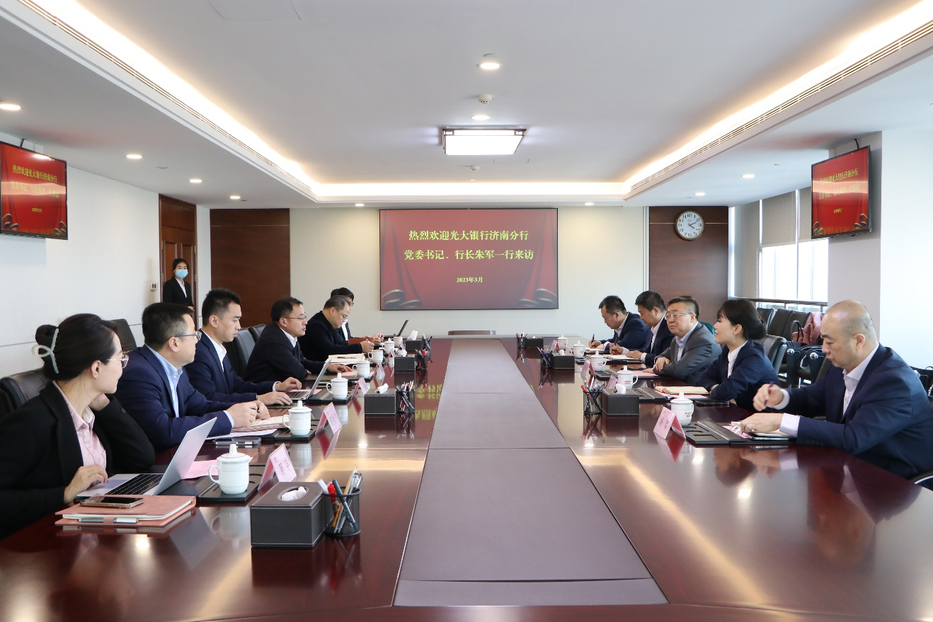 3月2日,光大銀行濟南分行黨委書記、行長朱軍到訪魯商集團,集團黨委副書記、董事、副總經理朱華建熱情接待并舉行座談。