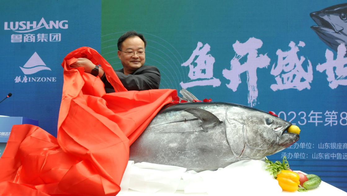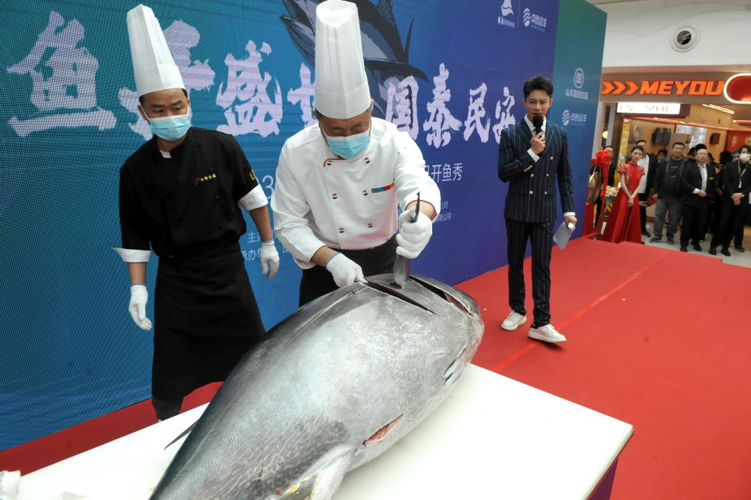 活動當天正值“世界金槍魚日”。現場,王緒超為重達160斤的藍鰭金槍魚揭開紅綢,朱華建鳴鑼,隨后雙方代表共同撫刀開啟金槍魚主題開魚秀。這條藍鰭金槍魚被稱為“金槍魚中的皇族”,屬于非常稀有的頂級食材。伴隨資深開魚師的熟稔操作,難得一見的制作流程于現場完美呈現。