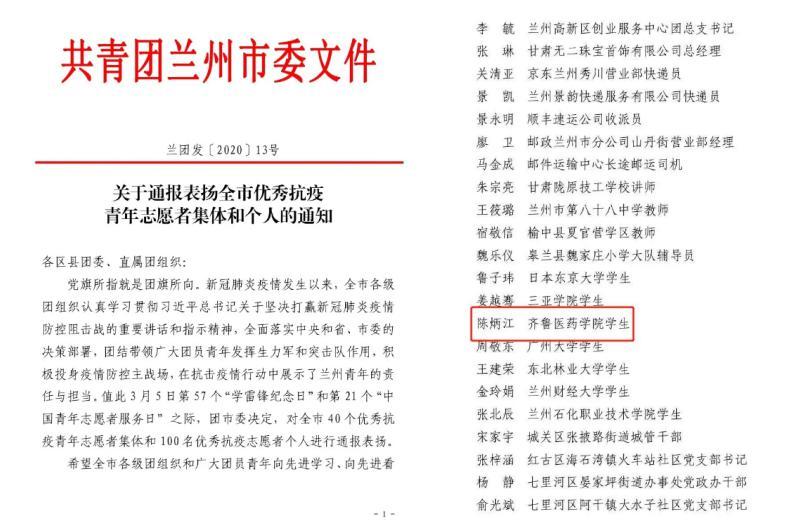 公共衛生與檢驗學院2019級檢本1班成凌云同學,在疫情防控工作中表現突出,被共青團靖遠縣委評為“優秀志愿者”。2018級檢本2班安蕾同學,積極響應號召,參加當地疫情防控工作,被“大眾網·海報新聞”報道。