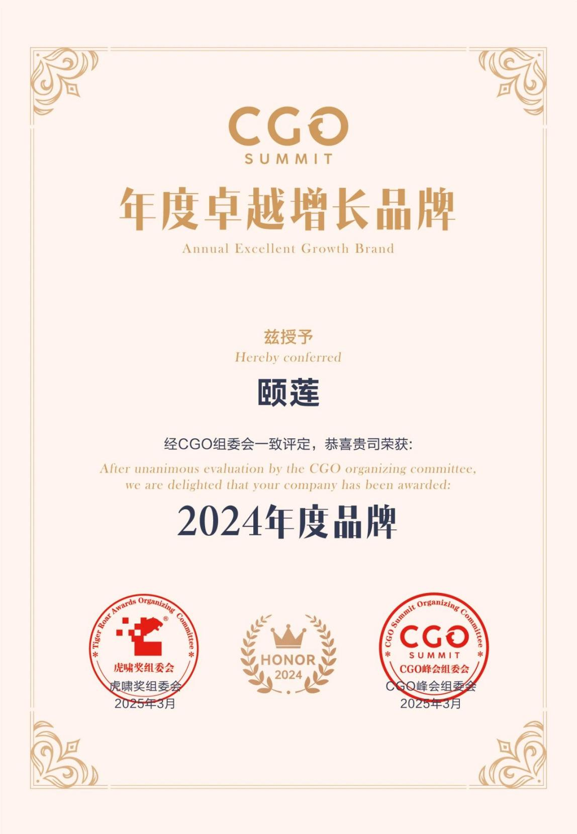 近日,在2025(第三屆)CGO品牌增長峰會上,頤蓮憑借卓越的品牌策略、市場拓展能力及持續的創新精神,經過專家評審團多輪嚴格篩選與數據維度驗證,在眾多參選品牌中脫穎而出,榮膺2024年度卓越增長品牌殊榮。