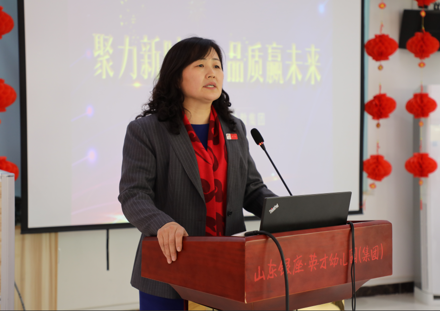 焦敏在對接了魯商集團2019年工作部署與要求之后,面向全體與會人員提出,2019年銀座幼教仍然以“高品質發展”為主線,突出改革與轉型,將宏觀戰略升級為“品質聚能戰略”,并以“賦能、轉型、創新、活力”為八字方針,在新舊動能轉換中聚動能,在品牌優勢下聚勢能,在互聯網+的思維中聚智能,進而提升品質,實現行動突圍。在重點舉措方面,提出“一三五七”部署。即一個中心(黨建),三個重點(三三一體化發展),五項措施(向創新要前途、向培訓要市場、完善機制控成本、向品質要聲譽及紅線意識),七項工作(調整組織架構、公司化發展、強化師德建設、升級5S精細化管理、拓展培訓項目、加快課程改革、開展資金運作)。