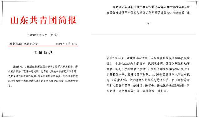 6月10日,“青島酒店管理職院指導退役軍人成立國旗護衛(wèi)隊和志愿消防隊”的消息,作為服務青年退役軍人典型案例得到《山東共青團簡報》2019年第9期報道。