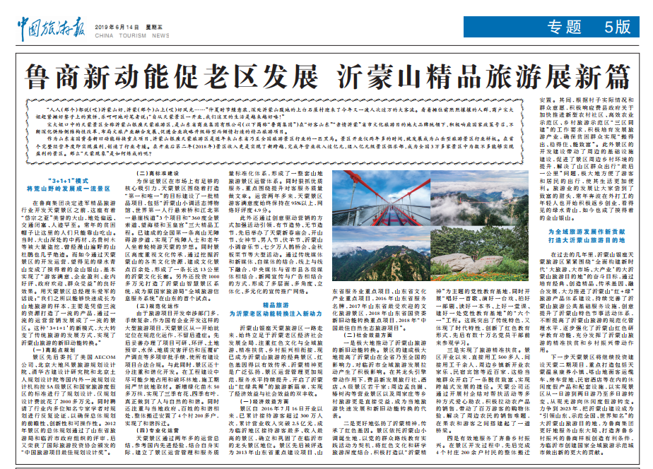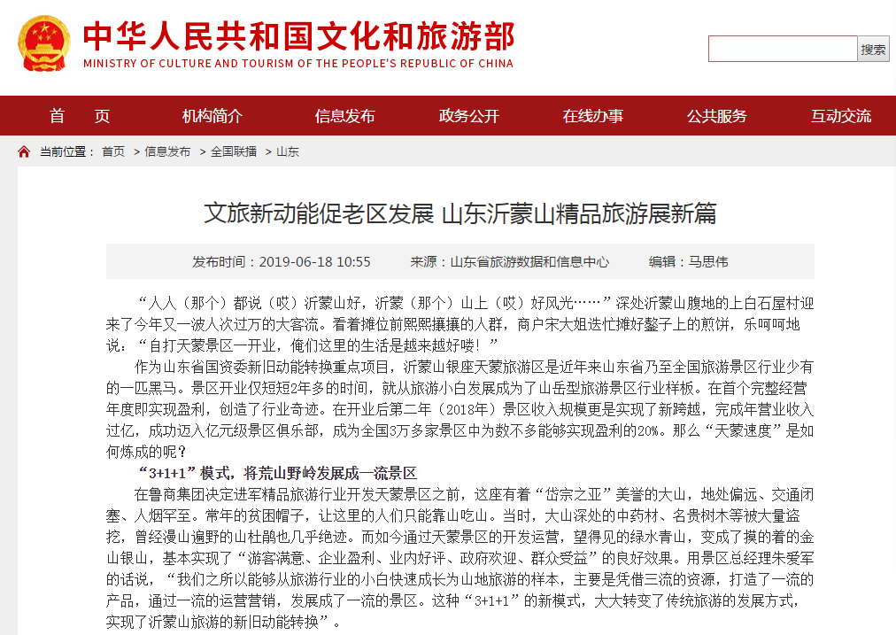 近日,文化和旅游部網(wǎng)站轉(zhuǎn)載中國旅游報(bào)文章《魯商新動(dòng)能促老區(qū)發(fā)展 沂蒙山精品旅游展新篇》,對(duì)山東省國資委新舊動(dòng)能轉(zhuǎn)換重點(diǎn)項(xiàng)目——魯商集團(tuán)所屬沂蒙山銀座天蒙旅游區(qū)發(fā)展模式進(jìn)行關(guān)注。以下為報(bào)道全文: