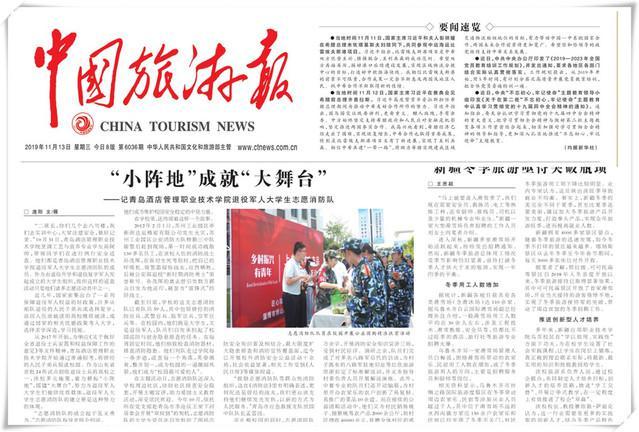11月13日,《中國旅游報》在第四版以《“小陣地”成就“大舞臺”——記青島酒店管理職業(yè)技術(shù)學(xué)院退役軍人大學(xué)生志愿消防隊》為題,大篇幅報道了學(xué)院積極響應(yīng)《關(guān)于做好全省退役士兵安置和權(quán)益保障工作的意見》等文件精神,多元施策,著力耕耘“小陣地”,搭建“大舞臺”,努力為退役軍人大學(xué)生們提供優(yōu)質(zhì)載體,切實取得良好實效的情況。全文如下: