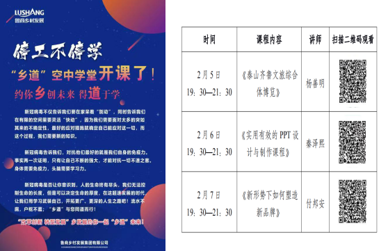 新內容。空中學堂將邀請國內外各領域頭部專家、高校教授、知名企業家、合作伙伴、內訓培訓師等,圍繞“管理能力、專業能力、經營能力、價值觀、跨界知識及資源整合能力提升”等組織培訓學習。第一階段課程于2月5日至7日每晚19:30-21:30上線,內容突出專業性和實用性,助力打造復合型鄉村振興人才。