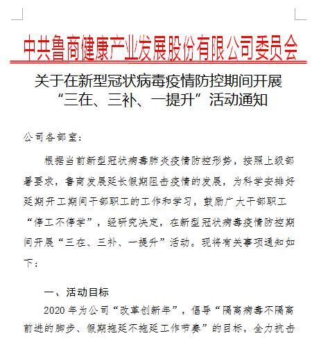 根據當前新型冠狀病毒肺炎疫情防控形勢,魯商健康產業發展股份有限公司(簡稱魯商發展)黨委按照上級統一部署延長假期阻擊疫情。為科學安排好延期開工期間干部職工的工作和學習,鼓勵廣大干部職工“停工不停學”,面向全體職工在疫情防控期間開展“三在三補一提升”活動。