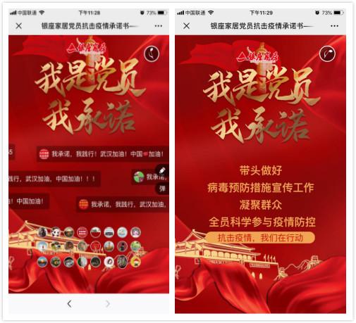 當前,疫情防控形勢依然嚴峻。2月8日,銀座家居黨委要求廣大黨員干部帶頭落實疫情防控責任,帶頭落實各項疫情防控措施,號召全體黨員堅持共同抗擊疫情,認真承諾踐行,切實發(fā)揮先鋒模范作用。銀座家居黨委書記、董事長張慶勝帶頭簽訂《抗擊疫情承諾書》,并鼓勵全體黨員干部群眾團結一心,筑牢疫情防控堡壘,樹牢堅決打贏疫情阻擊戰(zhàn)的信心。各級黨組織利用微信群等多種線上方式,組織廣大黨員干部簽訂《抗擊疫情承諾書》,并將黨員簽訂好的承諾書以圖片形式存檔,確保黨旗在每一個疫情防控的陣地高高飄揚。截至目前,全體黨員共簽訂298份《抗擊疫情承諾書》。大家在承諾踐諾留言墻表示,在目前疫情防控的關鍵時刻,作為一名黨員,一定不忘初心、牢記使命,為打贏疫情防控阻擊戰(zhàn)貢獻自己的一份力量。