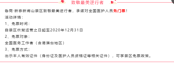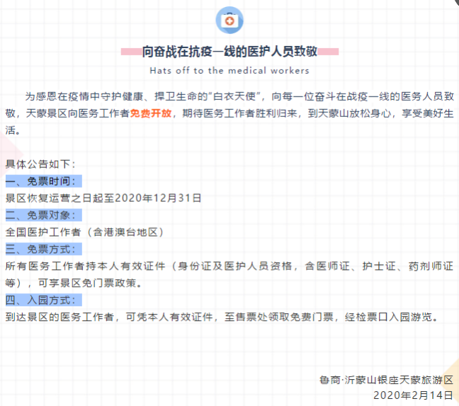 致敬逆行,感恩天使。為向奮戰(zhàn)在抗擊新冠肺炎疫情一線的醫(yī)務(wù)工作者致敬,2月14日,山東省文旅集團與全國省級國有集團聯(lián)盟共同發(fā)起“勝利后,讓我們重啟2020的美好”——致敬白衣戰(zhàn)士愛心公益活動,省文旅集團旗下魯商·銀座天蒙旅游區(qū)、魯商·新泰新甫山景區(qū)率先發(fā)布公告,2020年內(nèi)向全國醫(yī)務(wù)工作者免費開放,邀請他們在戰(zhàn)勝疫情后到景區(qū)放松身心。