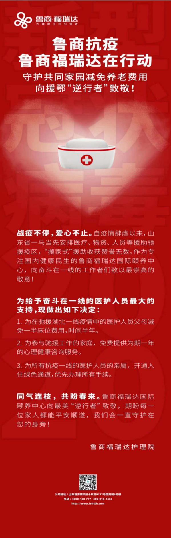 近日,為向馳援湖北一線的醫(yī)護(hù)人員表達(dá)敬意,魯商發(fā)展所屬的魯商福瑞達(dá)國(guó)際頤養(yǎng)中心決定為馳援湖北一線的醫(yī)護(hù)人員父母減免一半床位費(fèi)用,時(shí)間半年。