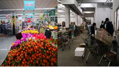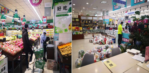早上8:00,物業(yè)部同事開始了營業(yè)前消殺工作,對(duì)賣場、辦公區(qū)的購物車、生鮮柜臺(tái)、收銀臺(tái)、地面、門把手、加工間、衛(wèi)生間、餐廳、垃圾桶、更衣室等進(jìn)行全面消毒滅菌處理。蔬菜配貨車到達(dá),為配貨司機(jī)測(cè)溫、登記、消毒,在停車場外完成第一道檢測(cè)。