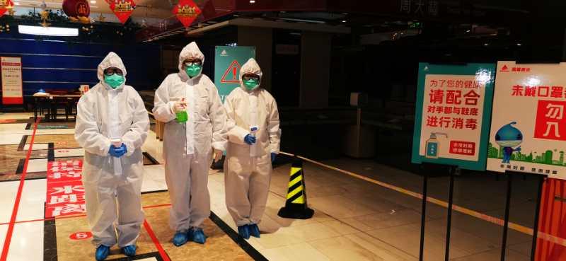 體溫測(cè)量處、收銀臺(tái)的“女漢子”們整裝待發(fā),防護(hù)服、護(hù)目鏡、手套、帽子、鞋套、口罩,互相檢查防護(hù)裝備。顧客登記本、消毒酒精、手部消毒液、測(cè)溫槍、備用口罩一樣不能少。