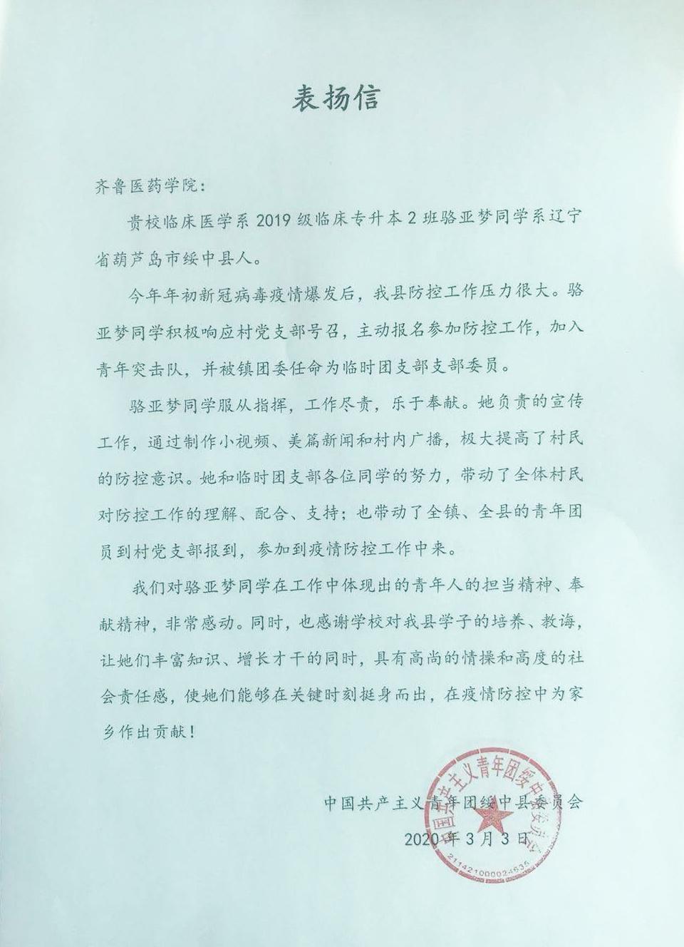 近日,齊魯醫(yī)藥學(xué)院臨床醫(yī)學(xué)院2019級臨床專升本2班駱亞夢同學(xué)(遼寧省葫蘆島市綏中縣人),因在疫情防控工作中表現(xiàn)出色,受到了共青團(tuán)綏中縣委員會致信表揚。