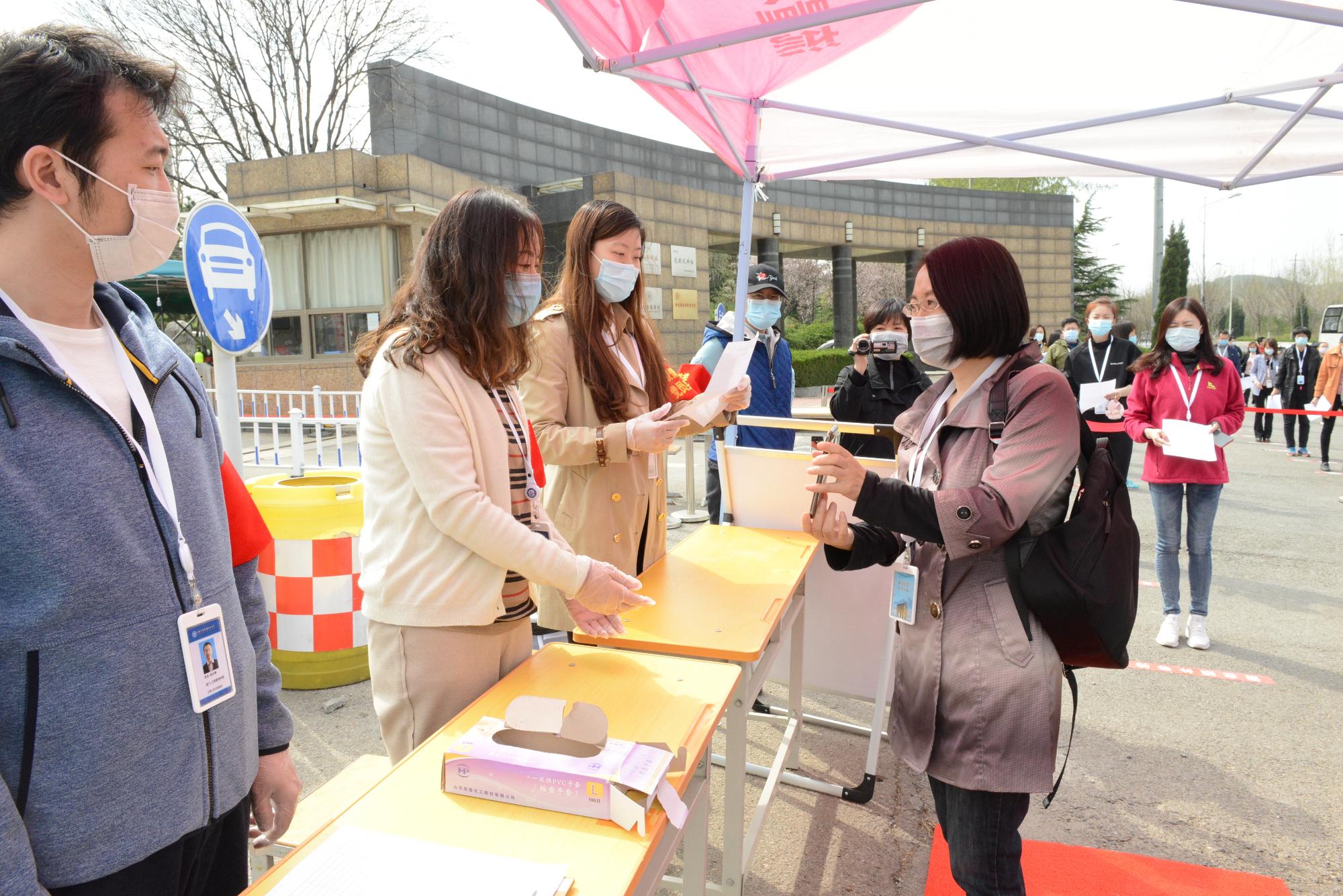 在校門口,演練人員模擬學生下車后進行個人及行李箱消毒、檢測體溫等程序,按照工作人員引導到各學院現場報到通道,辦理入校手續。按照防控規范前后間隔1米的距離,工作人員收取學生返校承諾書,有序進行體溫測量、身份登記以及電子健康通行碼核驗后進入校園。現場還模擬了體溫異常學生處置流程。