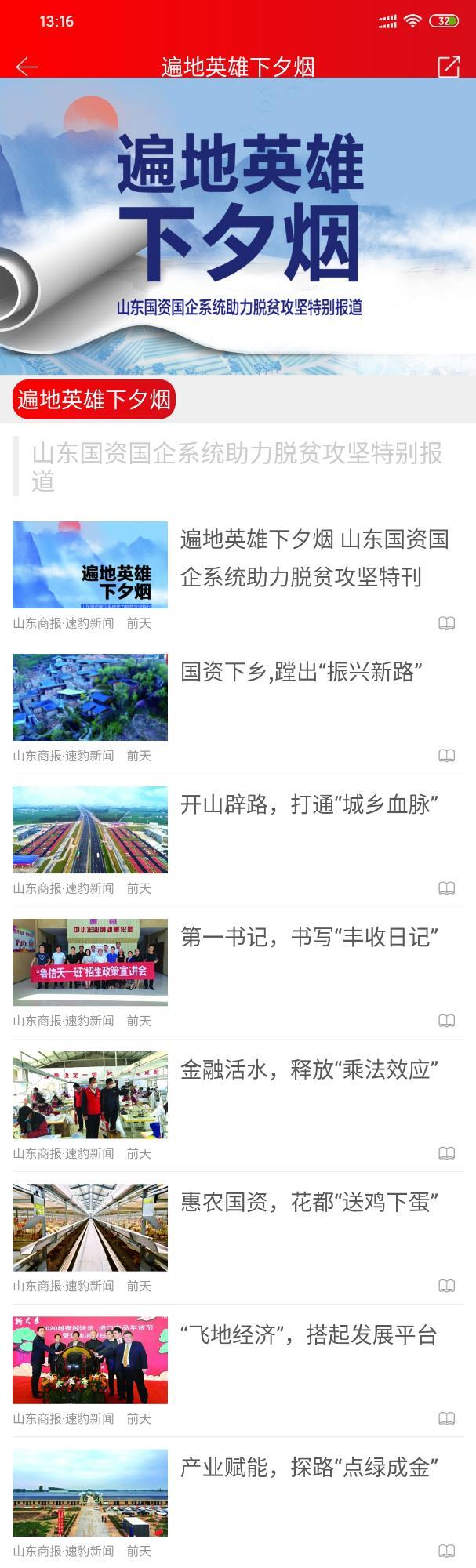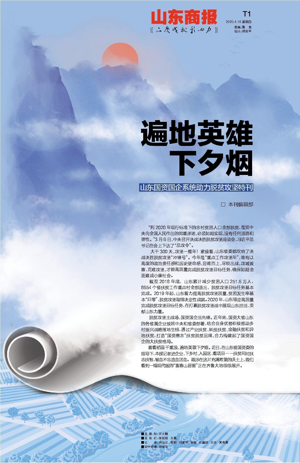 4月16日,在省國資委的指導下,《山東商報》推出8個整版規模的《遍地英雄下夕煙——山東國資國企系統助力脫貧攻堅專刊》,并在速豹新聞客戶端等新媒體平臺同步推出相關報道,全方位、多角度呈現山東國資國企助力脫貧攻堅過程中的典型做法、典型事跡。