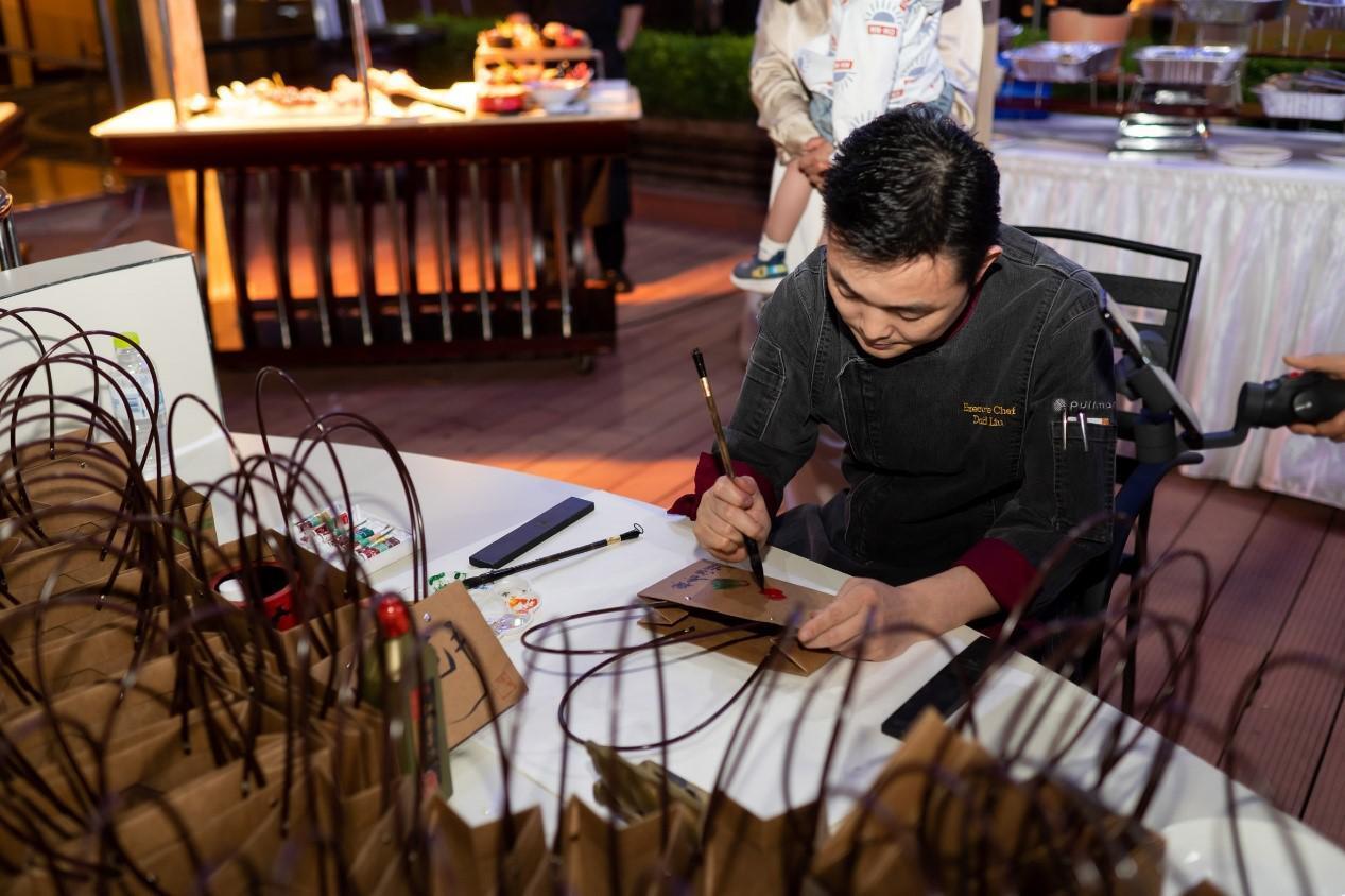 “大家好,此次作品為三份手寫(xiě)菜單,5.21元起拍,競(jìng)拍開(kāi)始!”臨沂魯商鉑爾曼行政總廚劉國(guó)安將書(shū)法與菜單相結(jié)合,富有藝術(shù)氣息?,F(xiàn)場(chǎng)以及手機(jī)端的粉絲興趣濃厚,紛紛舉牌,最終三款產(chǎn)品以556元成交。隨后,劉廚變身畫(huà)師,在手提袋上畫(huà)滿了寓意美好的白菜、櫻桃等,客人購(gòu)買后可將手提袋裝滿粽子并帶走,現(xiàn)場(chǎng)收入近2000元。