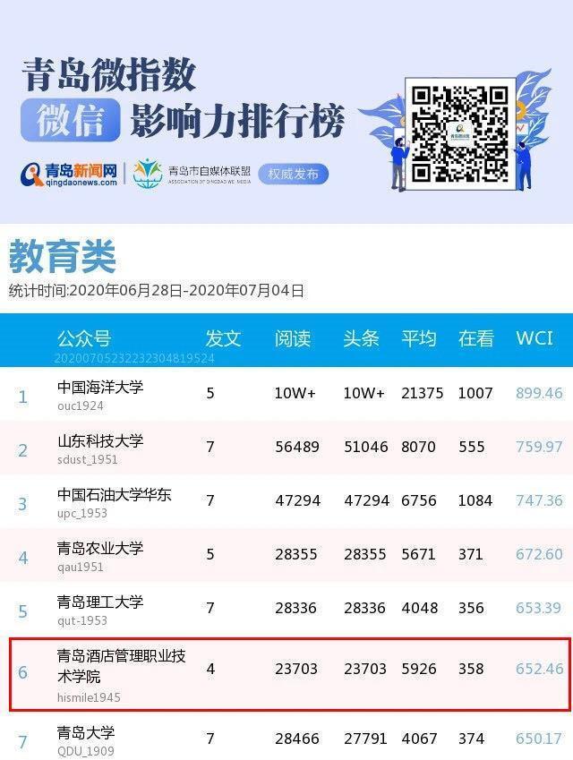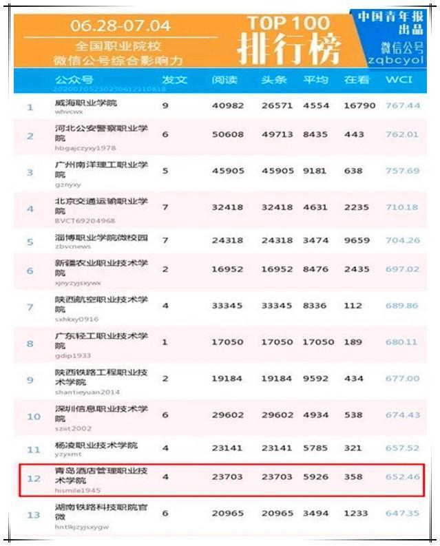 7月6日,中國青年報發布“全國普通高校微信公號排行榜(6.28-7.4)”,青島酒店學院官方微信公眾號“青島酒店管理職業技術學院(hismile1945)”綜合影響力入圍全國職業院校第12位,4篇推文全部進入全國職業院校單周文章閱讀量TOP100排行榜。