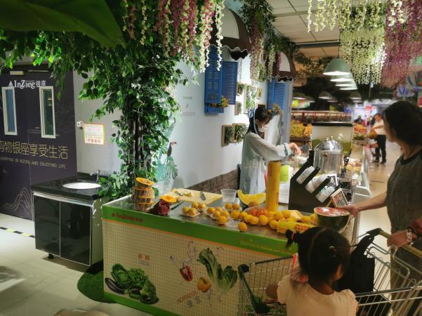 進(jìn)入超市,首先映入眼簾的是用大樹、藤條、草坪裝飾的“鮮營小鎮(zhèn)”,配搭婉轉(zhuǎn)的鳥鳴聲背景音效,讓人仿佛置身于森林公園。造型獨特的生鮮推頭與現(xiàn)場環(huán)境融為一體,完美地將產(chǎn)品展示出來,提升了顧客的購買欲。日配區(qū)“美食坊”,以古色古香的鏤空式窗格進(jìn)行裝飾,旁邊設(shè)有古亭風(fēng)格的休息就餐區(qū),與古運河文化相結(jié)合,喚醒人們的城市記憶。特色鮮明的裝修風(fēng)格吸引不少年輕人駐足,打卡拍照,大家紛紛表示,這樣購物就像在逛公園,真的想多來幾次。