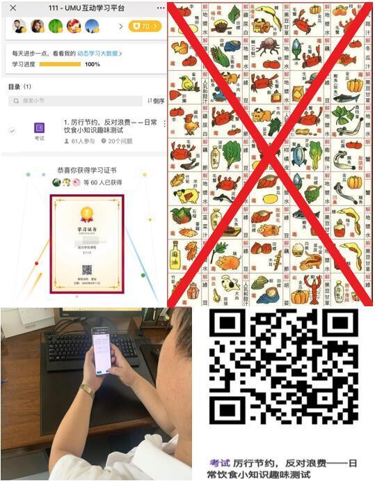 投資公司利用飯后時間突擊建立“厲行節(jié)約·反對浪費——日常飲食小知識趣味測試”微信群組,并在群內(nèi)展示了測試小程序二維碼,邀請大家即時手機掃碼參與。參與答題的同事們熱情高漲,紛紛表示這種答題方式既能寓教于樂,讓死板的知識動起來,又能發(fā)現(xiàn)因以往錯誤認知而產(chǎn)生的食物浪費。