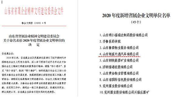 近日,山東省省屬企業(yè)精神文明建設(shè)委員會(huì)印發(fā)了《關(guān)于命名表彰2020年度省屬企業(yè)文明單位的決定》,山東銀座天逸汽車有限公司(簡稱銀座天逸)成功獲評(píng)“省屬企業(yè)文明單位”。