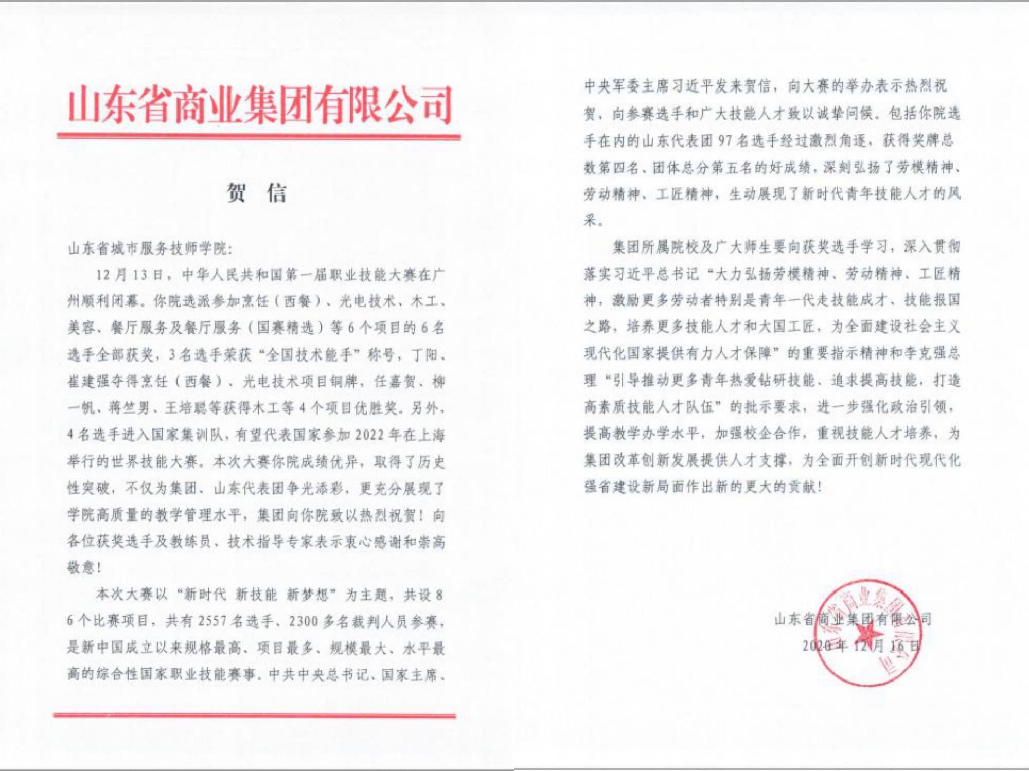 12月13日,首屆全國職業技能大賽在廣州順利閉幕。省城市學院選派參加烹飪(西餐)、光電技術、木工、美容、餐廳服務及餐廳服務(國賽精選)項目的6位選手全部獲獎,其中3位選手榮獲全國技術能手稱號,有4位選手進入國家集訓隊,有望參加2022年在上海舉行的世界技能大賽。魯商集團賽后致賀信,對學院取得的優異成績表示祝賀!