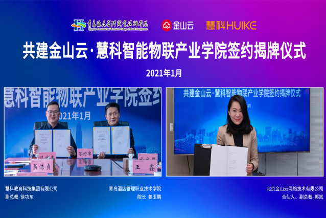 1月13日,青島酒店學(xué)院與北京金山云網(wǎng)絡(luò)技術(shù)有限公司、慧科教育科技集團“金山云·慧科智能物聯(lián)產(chǎn)業(yè)學(xué)院”舉行簽約揭牌儀式。北京金山云網(wǎng)絡(luò)技術(shù)有限公司合伙人郭嵐,慧科教育科技集團有限公司副總裁徐功東,學(xué)院黨委書記李達、院長姜玉鵬出席簽約揭牌儀式,黨委副書記王鑫主持。