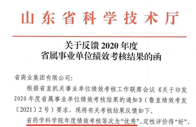 本次績效考核結果,是對省藥科院2020年度工作的認可,省藥科院將再接再厲,突出“黨建引領+科研創新”管理模式,穩步推進各項工作,開拓創新,砥礪奮進,奮力譜寫新時代發展新篇章,為打造全面創新的新魯商和建設新時代現代化強省貢獻藥科院力量,以優異成績慶祝中國共產黨成立100周年。