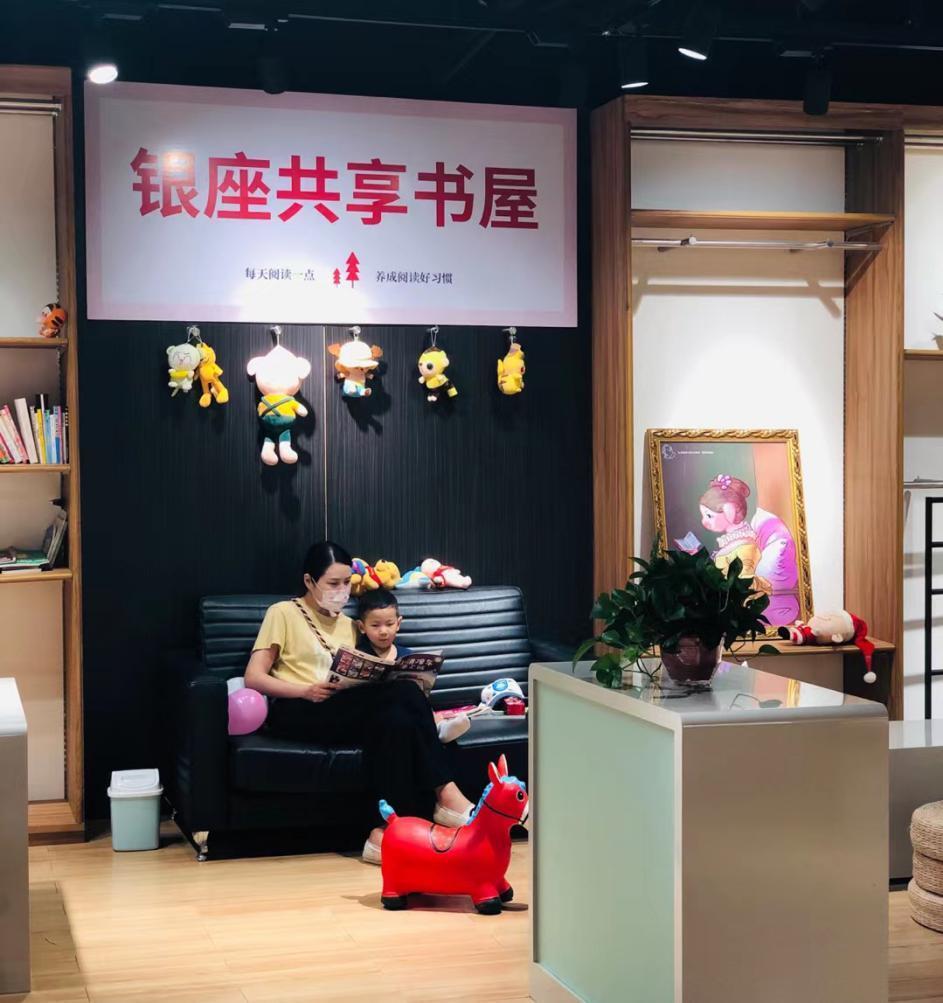 “共享書屋”坐落在銀座商城F2層,書屋內千余本書籍全部由員工自愿捐贈,現(xiàn)場布展了綠植、沙發(fā)、坐墊,營造溫馨的休憩學習氛圍。喧囂的都市,繁忙的一天,“共享書屋”靜謐溫馨,帶給消費者更多的舒適體驗。