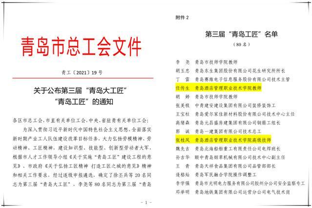 近日,青島市總工會(huì)下發(fā)《關(guān)于公布第三屆“青島大工匠”“青島工匠”的通知》,青島酒店學(xué)院烹飪學(xué)院張桂鳳、任傳生兩名教師獲評(píng)“青島工匠”。