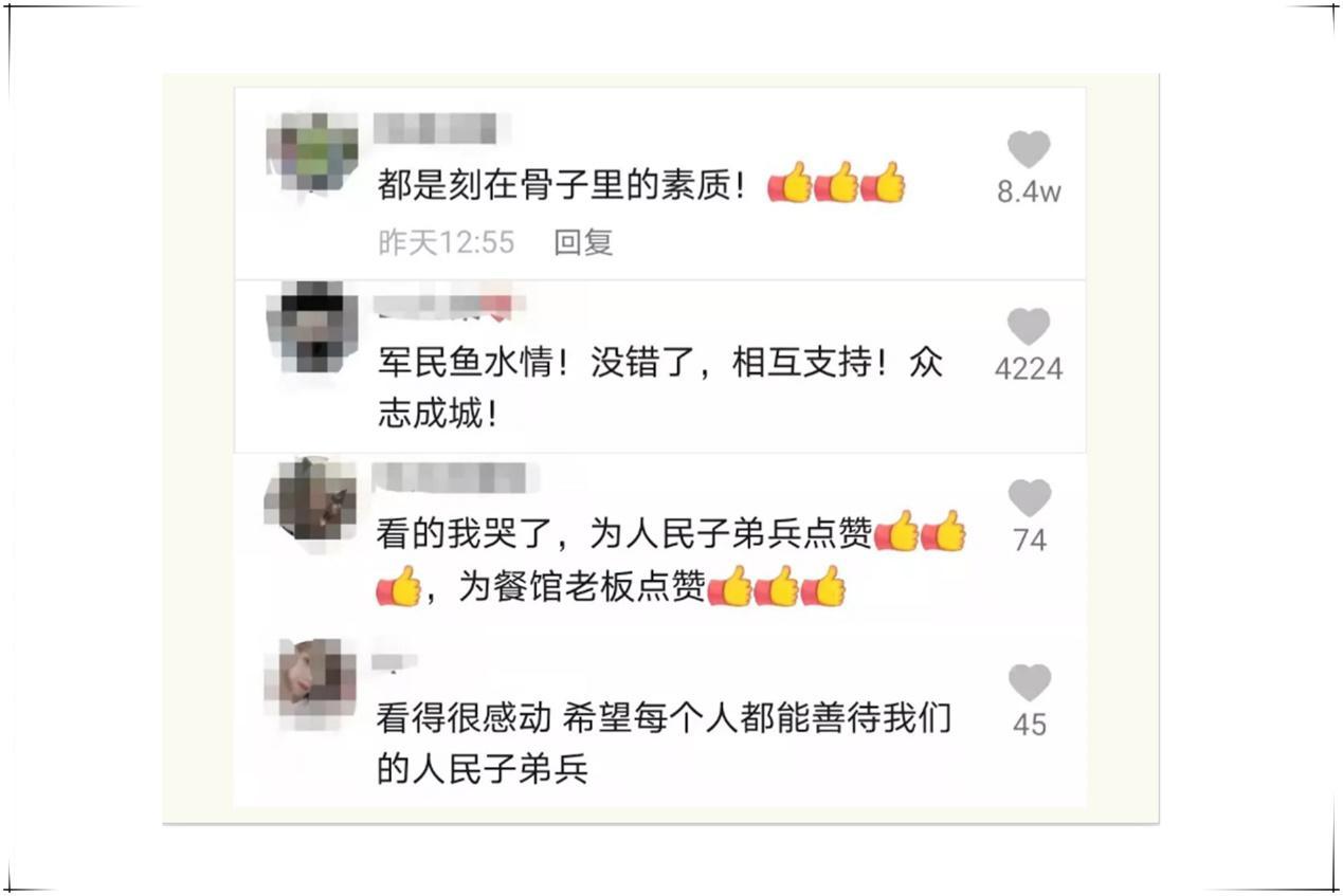 視頻發(fā)出后,網(wǎng)友紛紛留言:“都是刻在骨子里的素質!”“軍民魚水情!…相互支持!”。大家為人民子弟兵的行為點贊也為這份軍民魚水情而感動。