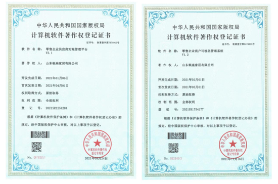 近日,銀座家居供應商返款對賬平臺、商戶可視化管理系統2項數字化轉型成果先后取得國家版權局計算機軟件著作權登記證書。