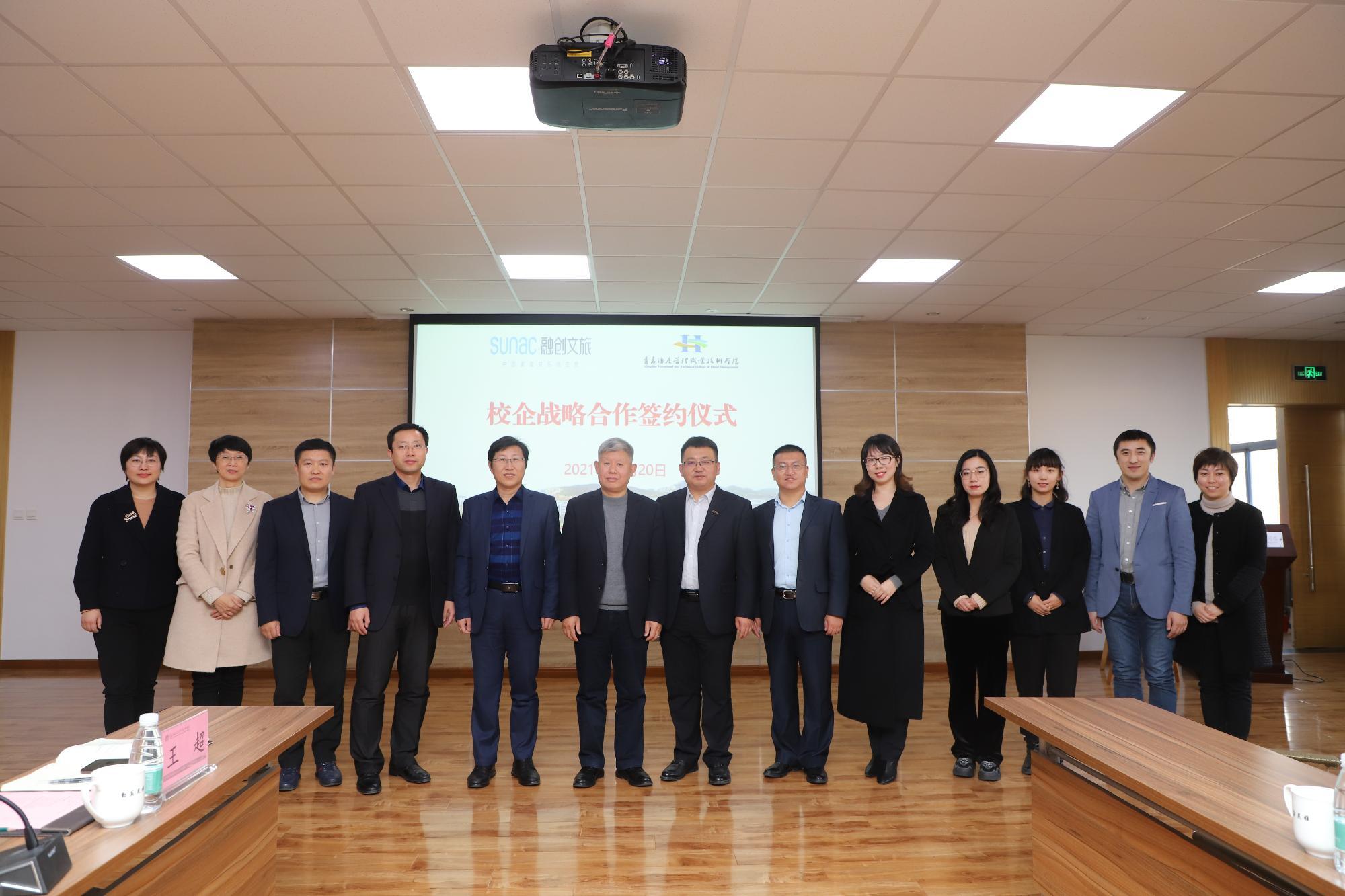 雙方簽署校企戰略合作協議,并為產學研戰略合作基地、“雙師型”教師培養培訓基地、“青島融創文旅現代學徒制班”揭牌。