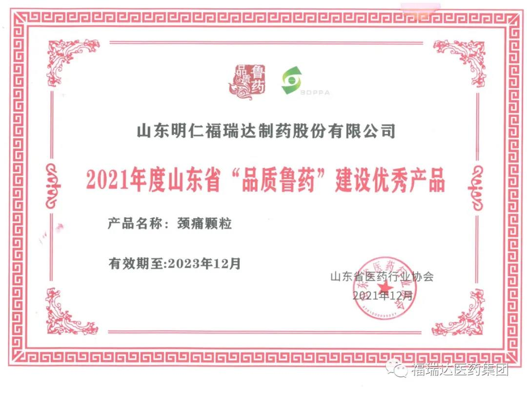 明仁頸痛顆粒是國家唯一治療神經根型頸椎病的中成藥,入選山東省火炬計劃,被列為國家重點新產品,榮獲2020年度品質魯藥和2020年度山東優質品牌,入選2020年度濟南優勢產品工業目錄和山東省制造業單項冠軍產品。此次獲獎是對明仁品牌和公司產品質量的高度認可。未來,明仁福瑞達將持續加大在產品生產和品控方面的投入,為健康事業增磚添瓦,為健康中國貢獻力量。