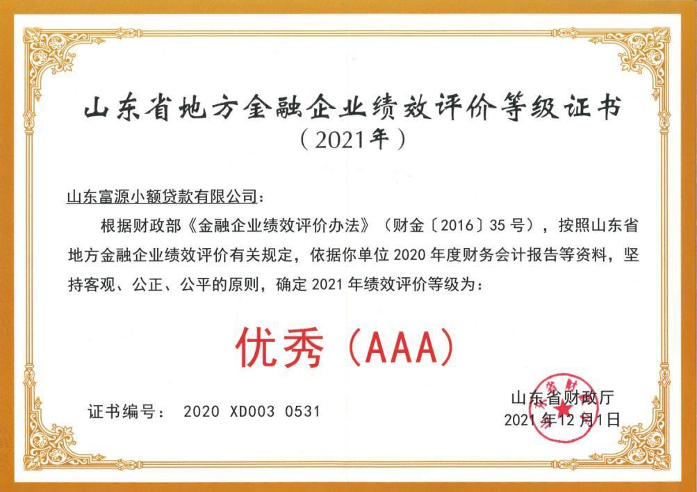 近日,省財(cái)政廳頒發(fā)2021年山東省金融企業(yè)績(jī)效評(píng)價(jià)等級(jí)證書,富源小貸獲得“AAA”優(yōu)秀等級(jí)。評(píng)價(jià)結(jié)果表示,其績(jī)效狀況在全國(guó)其他類金融企業(yè)中處于優(yōu)秀水平。至此公司已連續(xù)3年獲此最高評(píng)價(jià)。