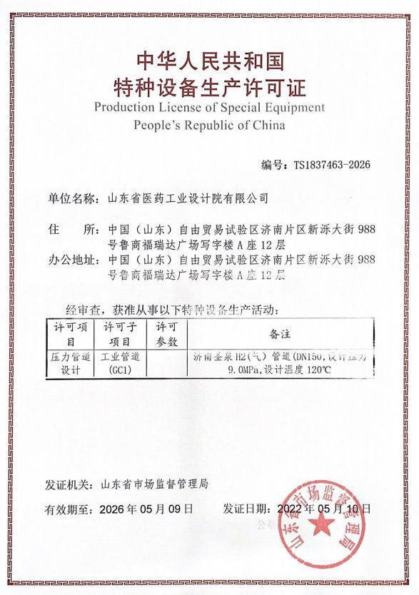 近日,經過山東省特種設備協會專家組、濟南市市場監管局監督組的嚴格審查,省醫工設計院順利通過壓力管道設計資質換證評審,取得省市場監督管理局頒發的“特種設備生產許可證”。