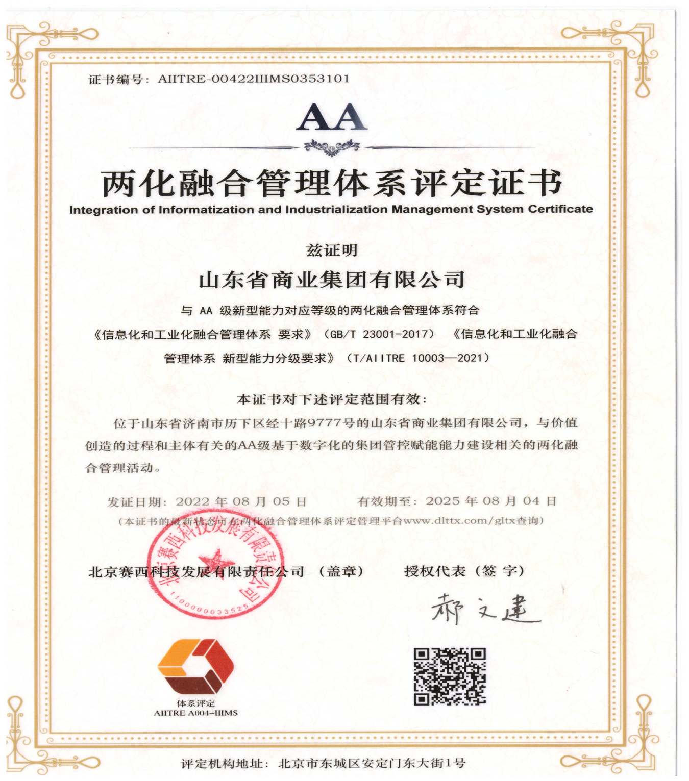 近日,集團順利通過工信部《信息化和工業化融合管理體系要求》(GB/T 23001-2017)及《信息化和工業化融合管理體系新型能力分級要求》(T/AIITRE 10003-2021)認證,取得兩化融合管理體系AA級評定證書,標志著集團在推進信息化和產業化融合方面得到權威認可,為進一步推動數字化轉型奠定了良好基礎。