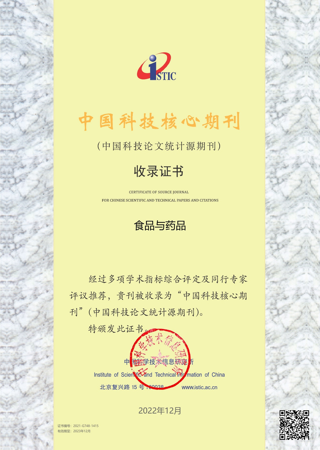 近日,2022年中國科技核心期刊(中國科技論文統(tǒng)計源期刊,CSTPCD)目錄發(fā)布,由山東省商業(yè)集團有限公司主管和山東省藥學科學院主辦的《食品與藥品》實現(xiàn)連續(xù)多年入選此目錄。