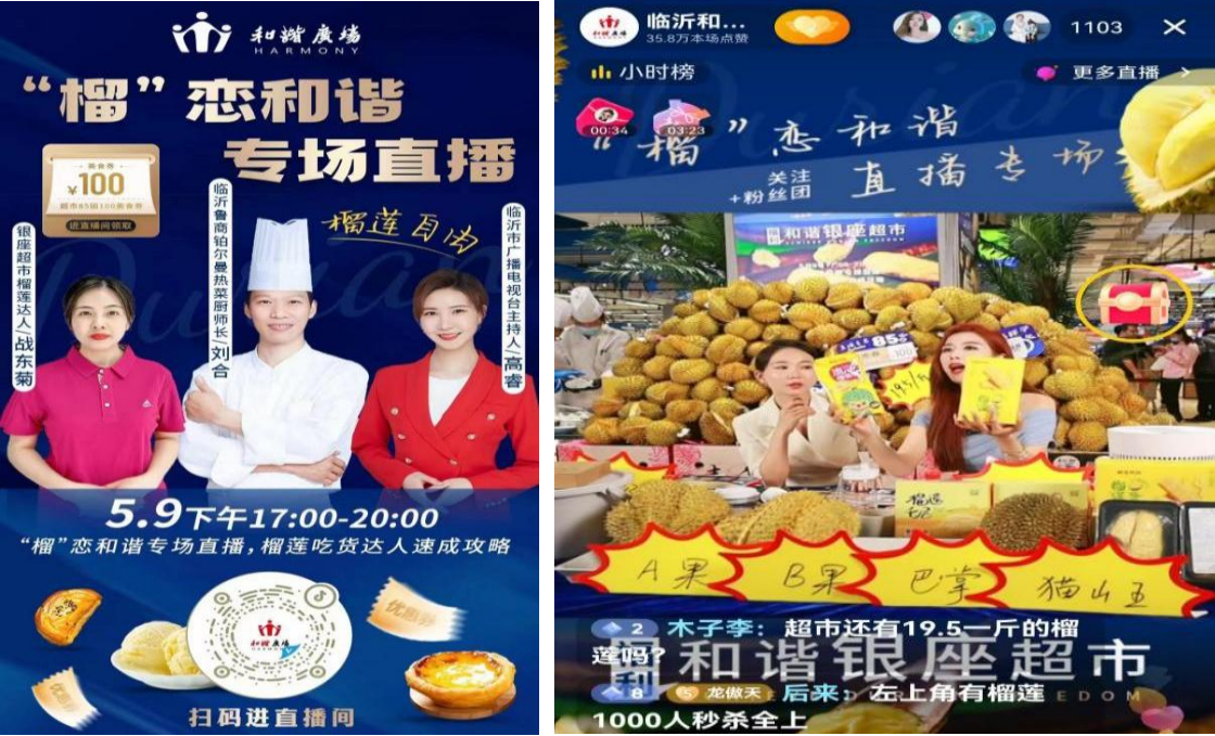 憑借前期積累的優(yōu)秀口碑,5月9日,臨沂和諧店以“榴戀和諧 品鑒美食”為主題,聯(lián)合臨沂鉑爾曼大酒店及網(wǎng)紅達人圍繞榴蓮品種分類、等級挑選、相關(guān)美食制作等開啟直播,直播當(dāng)天,線上團券銷售30.71萬元,直播間曝光38.38萬人次。