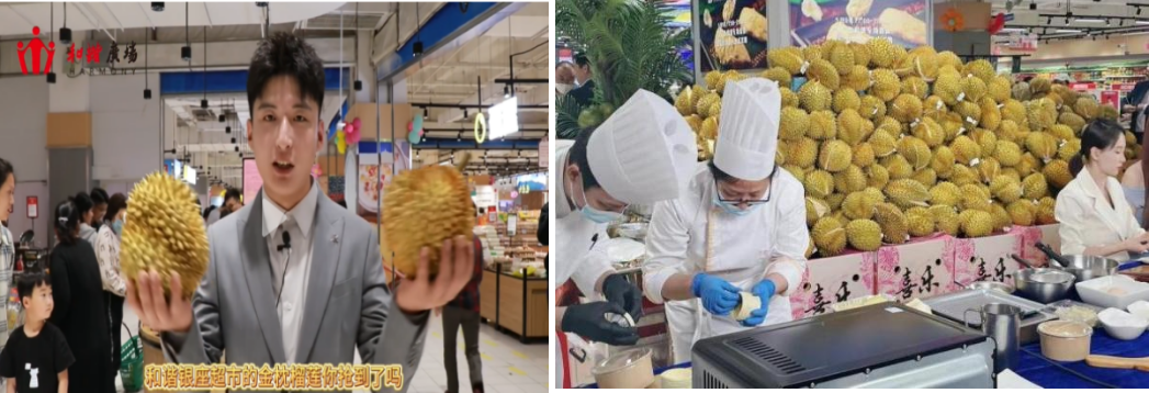 4月29日至5月3日,臨沂和諧店超市煥新開業(yè)之際,借助公司統(tǒng)一訂購泰國金枕榴蓮的價格優(yōu)勢,門店進行大堆頭陳列,提前兩天在抖音進行預(yù)售團購,銷售團券近80萬元。