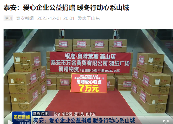 12月1日,“暖冬行動,心系山城”東西部協(xié)作公益捐贈活動在銀座泰萊區(qū)域泰山店舉行,門店攜手泰安市萬名商貿(mào)有限公司向山東省中投慈善公益基金會捐贈價值7萬余元的羽絨服、書籍、文具等物資,幫助重慶市的困難兒童溫暖過冬、好好學(xué)習(xí)。