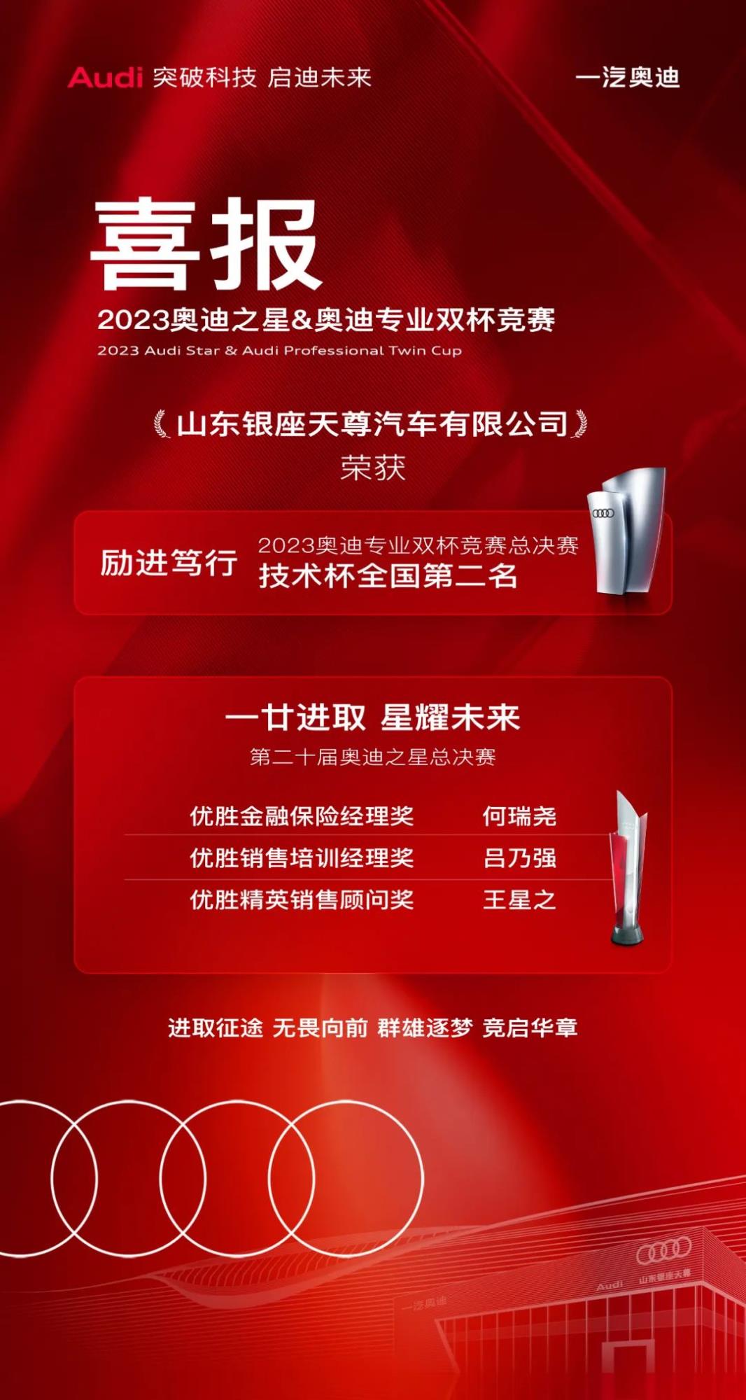 從心出發,卓·悅無盡。奧迪雙杯競賽是展示經銷商售后服務綜合實力的競技、交流和分享平臺。銀座天尊售后團隊憑借專業的技術知識和強勁的實操能力斬獲“2023年奧迪專業雙杯競賽-技術杯第二名”的殊榮。