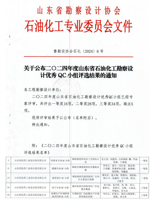 近日,由山東省勘察設計協會主辦的2024年度山東省石油化工勘察設計優秀QC小組評選結果揭曉,省醫工院申報的5項QC成果全部獲獎,榮獲一等獎2項、二等獎1項、三等獎2項。